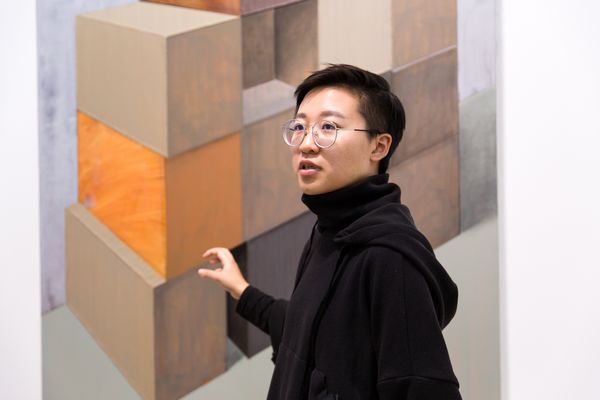 藝術家趙新宇,1989年出生于內(nèi)蒙古,2012年畢業(yè)于四川美術學院油畫系。趙新宇最早的創(chuàng)作,即為人所知的“車廂”系列,涉及了一種日常經(jīng)驗,后續(xù)階段的作品以情緒性和敘事性為底色,而使得整個畫面頗具戲劇色彩。在新作當中,這一痕跡的延伸則是趙新宇似乎試圖通過對畫面結構的編排,對比之前的作品,依舊是在構景,但卻在逐漸在取締物的現(xiàn)實性因素。新作當中技法的轉變,厚涂式的平推僅保留了一部分,新作當中的轉向在某種程度上僅僅構成了對于厚涂畫法的一個對立面發(fā)生,像是一次新的開場,畫面本體基本問題再次噴涌而來,在這一情形下,趙新宇通過對于框架結構式描繪的轉向,試圖引向一種對于畫面心理的感知。