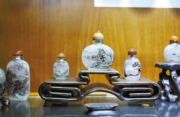 談及創(chuàng)作過程,楊藝說,鼻煙壺內(nèi)畫的制作,一般是在水晶壺或素玻璃壺內(nèi)壁,用特制的細(xì)筆,蘸取少許墨汁顏料,從小口中深入瓶中,反手作畫。創(chuàng)作內(nèi)畫,在常人看來,不可思議之處是有限的空間以及需要反手作畫,這也是每一個(gè)內(nèi)畫師面臨的主要難題所在,“創(chuàng)作內(nèi)畫時(shí),需要在這盈寸天地間做到手指和筆桿揮灑自如,這極其考驗(yàn)一個(gè)人的耐性。一手執(zhí)壺,一手作畫,作畫時(shí)需要在壺內(nèi)反手描繪,如此,才能讓人們?cè)谕獠靠吹秸娴漠嬒窠Y(jié)構(gòu)?!眱?nèi)畫的難度還在于,要長期低頭畫畫,因此還導(dǎo)致頸椎疼痛,中途為了治療疼痛休畫了好長一段時(shí)間。