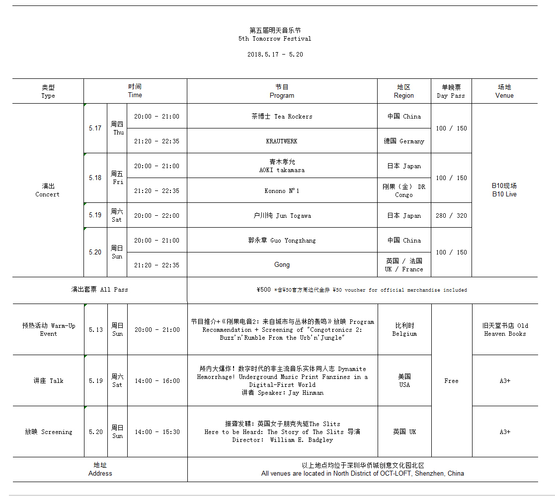 深圳新聞網(wǎng)訊 五月既至,好事即將發(fā)生。由深圳華僑城創(chuàng)意文化園主辦的第五屆明天音樂節(jié)將于2018年5月17日至20日在B10現(xiàn)場舉行。本屆明天音樂節(jié)作為“有形無界”華僑城創(chuàng)意文化園文博會分會場系列活動的重點(diǎn)項(xiàng)目,將邀請來自6個國家的7組音樂家/藝術(shù)家,呈現(xiàn)包括演出、講座、紀(jì)錄片放映在內(nèi)的多元節(jié)目。除此之外,策展人將于5月13日在舊天堂書店做節(jié)前預(yù)熱,屆時會有節(jié)目介紹環(huán)節(jié)和一場完整的放映活動。