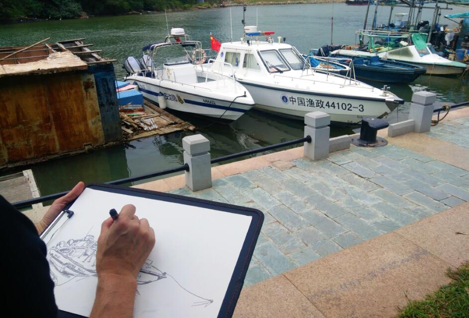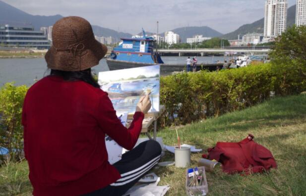 優(yōu)美的景色映入畫家們眼簾,點(diǎn)燃了他們的創(chuàng)作激情。來(lái)到鹽田之后,藝術(shù)家們紛紛找好寫生地點(diǎn),擺好畫架,迅速進(jìn)入創(chuàng)作的狀態(tài)。他們當(dāng)中一部分來(lái)到了鹽田漁港,鹽田海鮮街后的小漁村避風(fēng)港。蔚藍(lán)的大海、旁邊的綠樹、避風(fēng)塘內(nèi)停泊的船只、白色的海鳥、釣魚的人以及遠(yuǎn)方火熱的建設(shè)場(chǎng)景都呈現(xiàn)在畫家的筆端;另一部分藝術(shù)家來(lái)到了位于三洲田深圳會(huì)計(jì)進(jìn)修學(xué)院的梧桐溪谷,小橋流水人家、奇石山林則一一被傾注于畫紙。