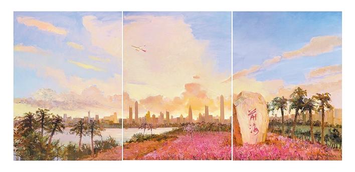 在創(chuàng)作中,文禎非用了現(xiàn)實(shí)的元素,前海標(biāo)志性石碑,棕櫚樹(shù)代表著南方特征,前海距離寶安機(jī)場(chǎng)很近,天空中的深航飛機(jī)象征著深圳開(kāi)放的胸懷,遠(yuǎn)處平安大廈等標(biāo)志性現(xiàn)代化建筑一字排開(kāi),地面是深圳市花簕杜鵑……“這些都是深圳人熟悉的現(xiàn)實(shí)素材,在畫(huà)面展現(xiàn)時(shí)更多地把對(duì)深圳未來(lái)發(fā)展的憧憬和信心放入了畫(huà)面,調(diào)整了前海石碑與建筑的視覺(jué)關(guān)系,地面一片簕杜鵑是深圳創(chuàng)業(yè)初期英雄主義激情的象征,更代表著新時(shí)期深圳創(chuàng)新創(chuàng)造的活力與熱情;現(xiàn)代建筑的背景也預(yù)示著深圳40年來(lái)的成就也為前海發(fā)展提供了堅(jiān)實(shí)基礎(chǔ);早晨天空中朝霞放射狀的光芒萬(wàn)丈,表達(dá)了對(duì)未來(lái)的憧憬……”文禎非滔滔不絕中透露出創(chuàng)作時(shí)的激情。