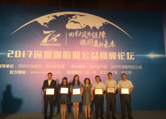 7月6日,“2017深圳保險(xiǎn)業(yè)公益高峰論壇”在深圳五洲賓館盛大召開。太平財(cái)險(xiǎn)深圳分公司榮獲“2017深圳保險(xiǎn)業(yè)精準(zhǔn)扶貧先進(jìn)單位”稱號(hào)。