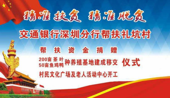 自交通銀行深圳分行對口幫扶禮坑村,開展"雙精準(zhǔn)"扶貧以來,禮坑的經(jīng)濟(jì)社會發(fā)展和村容村貌發(fā)生顯著變化,積貧積弱的小山村呈現(xiàn)欣欣向榮的新氣象。積土成山、積水成淵,200畝茶山破土而出、蔚然成綠,50畝養(yǎng)殖基地竣工落成、生機(jī)勃勃,三萬魚苗、數(shù)千雞苗茁壯生長,村民文化廣場、老年活動中心、道路硬底項目、山村亮燈工程躍然紙上,逐次開工建設(shè),禮坑正創(chuàng)造并綻放新的希望,村民笑容淳厚,各級由衷點贊。紫金縣領(lǐng)導(dǎo)、縣扶貧工作總負(fù)責(zé)人廖振輝表示:"交通銀行深圳分行是真重視、真扶貧、扶真貧,在對口紫金的扶貧單位中首屈一指,無論在河源市的扶貧工作考評中,還是在代表河源參加的廣東省扶貧工作考評中,雙雙獲得優(yōu)秀評價,真誠感謝交行,紫金要和交行一起努力,讓禮坑成為社會主義新農(nóng)村示范村建設(shè)中的示范點"。