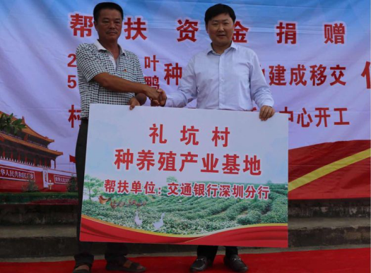 當(dāng)日,交通銀行深圳分行籌劃建設(shè)的茶山、種養(yǎng)殖基地、新一批雞苗和2017年度專項扶貧資金正式移交和撥付給禮坑村,并舉行了村民文化廣場開工奠基典禮。陳隃表示,交行深圳分行把幫扶禮坑村做為落實黨的政策的重點工作,做為國有銀行承擔(dān)政治責(zé)任、社會責(zé)任的重要出發(fā)點,做為加強(qiáng)黨的建設(shè)的重要抓手,下一步圍繞三個轉(zhuǎn)變繼續(xù)深化扶貧工作,一是工作目標(biāo)轉(zhuǎn)向社會主義新農(nóng)村建設(shè),努力將禮坑村建設(shè)成新農(nóng)村建設(shè)示范村中的示范點;二是工作方法從貧困戶脫貧向產(chǎn)業(yè)脫貧轉(zhuǎn)變,繼續(xù)發(fā)掘新項目,形成更加持續(xù)化的產(chǎn)值和收益;三是在制度建設(shè)上下功夫,強(qiáng)化社會主義新農(nóng)村建設(shè)的制度先行和制度示范。