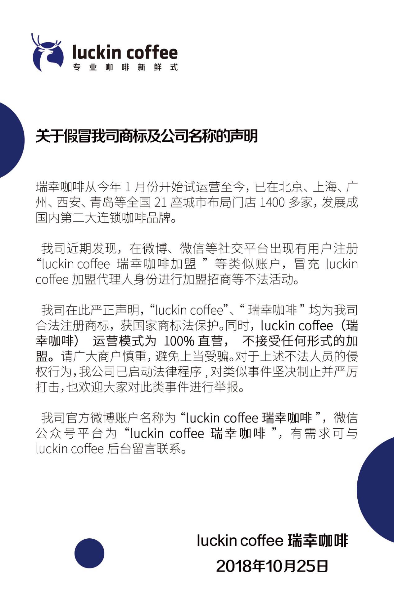 近日,瑞幸咖啡官宣聲明:luckin coffee瑞幸咖啡堅持運營模式為100%直營,不接受任何形式的加盟,請廣大商戶慎重,避免上當受騙。