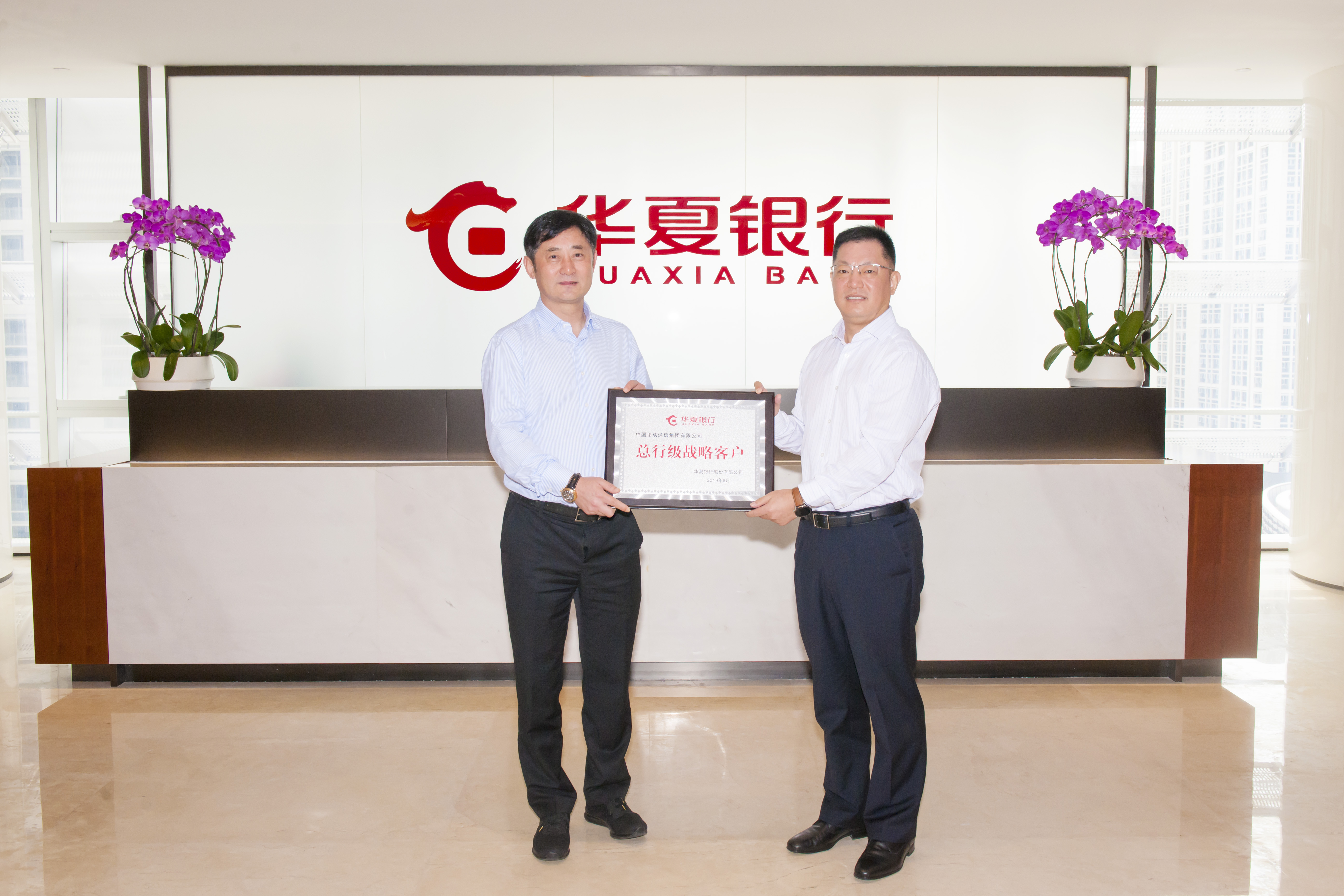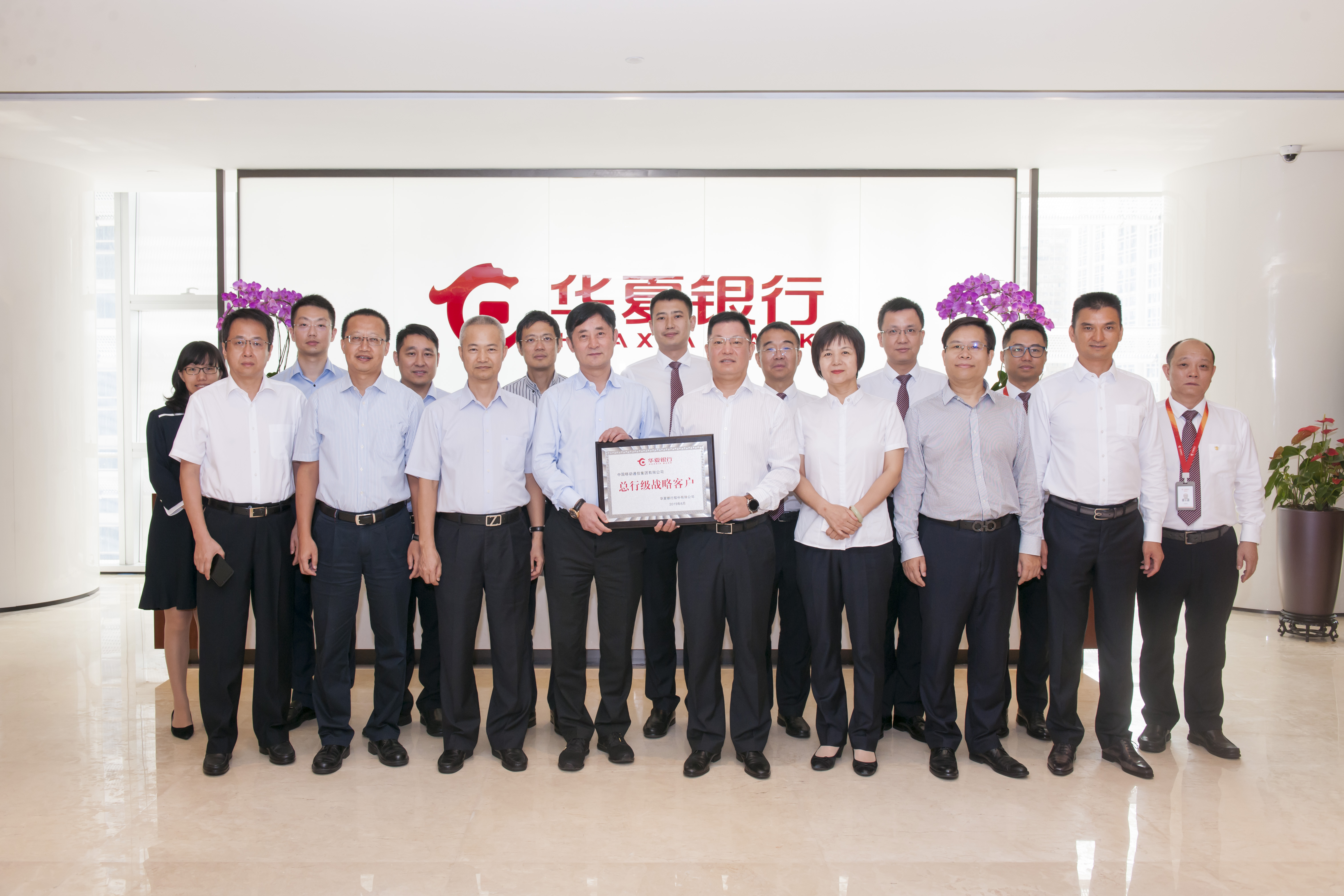 簽約儀式前,華夏銀行深圳分行受總行委托向中國(guó)移動(dòng)通信集團(tuán)有限公司頒發(fā)“總行級(jí)戰(zhàn)略客戶”牌匾。