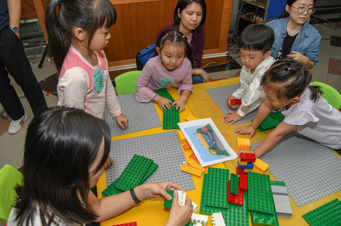 認真聽完講解后,“小小建筑師”們便各自拿著設(shè)計藍圖,發(fā)揮想象,開始了今天的DIY之旅?!暗鬃詈昧耍厦娴念伾羌t黃交替的……”活動現(xiàn)場,一位小朋友進度很快,已經(jīng)搭建過半,他一邊看著圖紙,一邊構(gòu)思著下一步。在被問及為什么底座缺失了幾塊積木時,這位“小小建筑師”得意的告訴記者:“我這個塔樓可是建在礁石上的,你見過哪一塊礁石是整整齊齊的呀?”