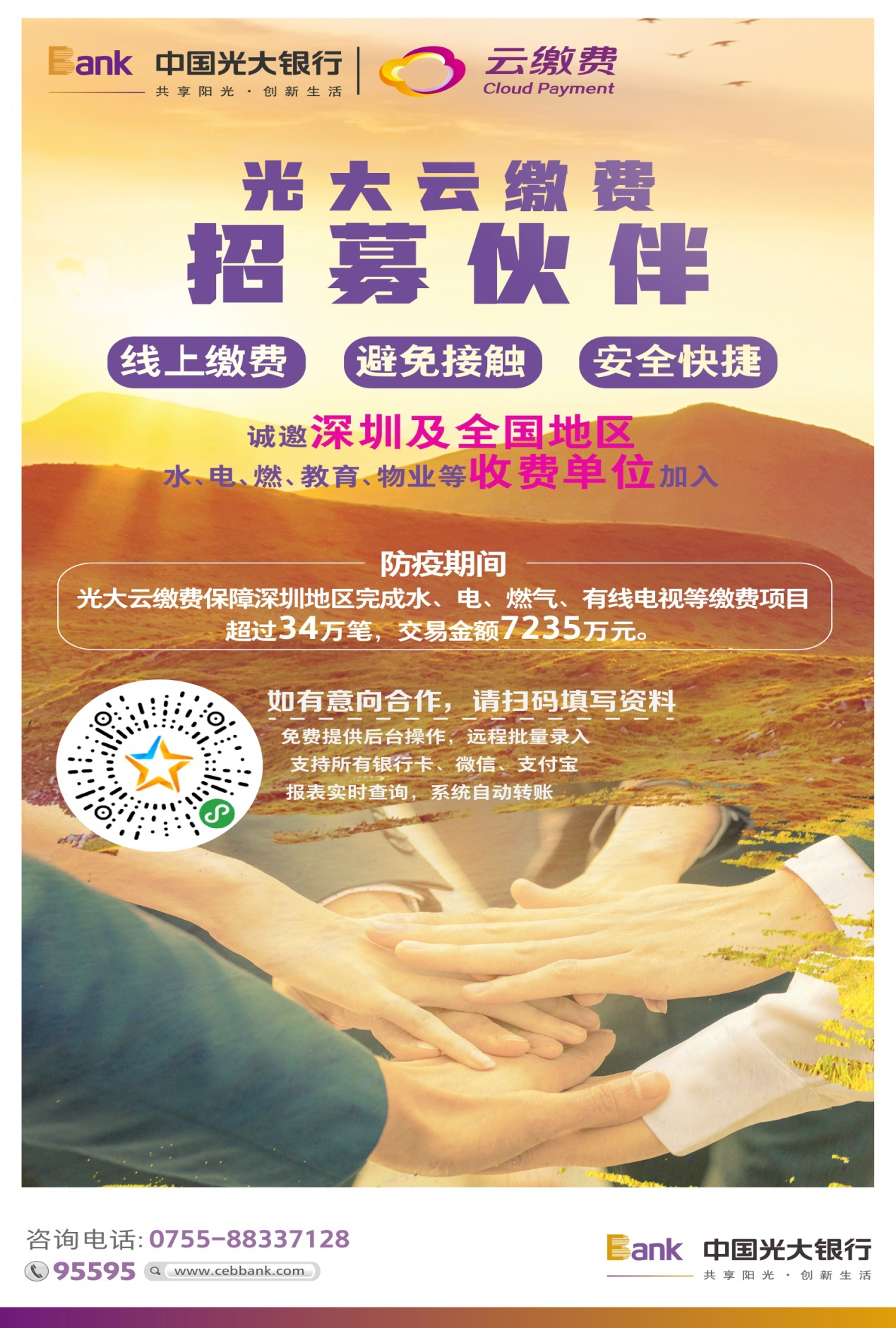 守望相助,共克時艱。面對新型冠狀病毒疫情防控的緊張形勢,為有效阻斷病毒傳播渠道,光大銀行深圳分行積極響應國家號召,充分發(fā)揮云繳費線上便民繳費服務優(yōu)勢,全面助力打贏“防疫”阻擊戰(zhàn)。