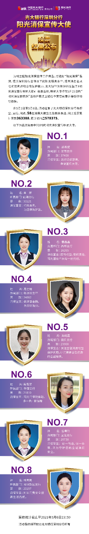 深圳新聞網(wǎng)·見圳客戶端2021年5月8日訊 昨日,光大銀行深圳分行“陽光消保宣傳明星大使”線上投票圓滿結(jié)束,從58名宣傳大使中投票產(chǎn)生了賴春妮、肖雨、曹晶晶、周之靖、黃曉霞、蔣易萱、曾粵玲、林思思8名陽光消保宣傳明星大使。明星大使將在5月15日的“陽光消保健康跑”活動開幕式上被授予榮譽勛章并接受行領(lǐng)導(dǎo)授旗。5月1日,光大銀行深圳分行發(fā)起了“陽光消保宣傳明星大使”線上投票,旨在樹立起陽光消保宣傳工作典型,打造“陽光消?!逼放?,提升深圳分行全體員工的陽光服務(wù)水平,提高消費者風(fēng)險防范意識和自我保護(hù)能力,提升光大在深圳地區(qū)的品牌影響力。投票活動得到社會熱烈響應(yīng),據(jù)統(tǒng)計,此次累計票數(shù)達(dá)363388次。