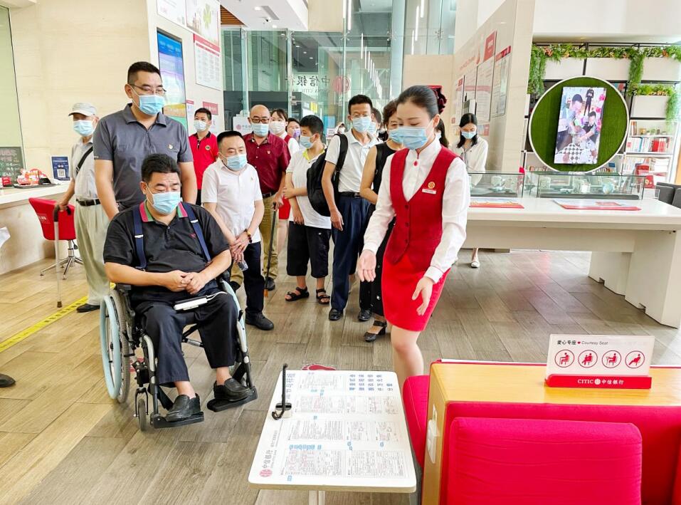 交流座談會結(jié)束后,全體黨員干部來到中信銀行深圳城市廣場旗艦支行現(xiàn)場體驗網(wǎng)點無障礙設施和服務,支部黨員與障礙人士現(xiàn)場溝通交流,為改進無障礙服務提出有益建議。