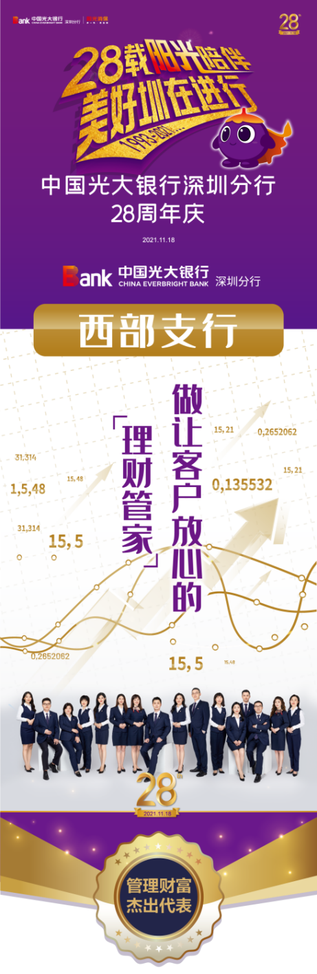 作為財(cái)富管理業(yè)務(wù)的先行者,光大銀行一直致力追求做讓客戶放心的“理財(cái)管家”。西部支行始終堅(jiān)定朝著總分行打造“一流財(cái)富管理銀行”的戰(zhàn)略目標(biāo)方向趕超奔跑,建設(shè)專業(yè)的財(cái)富管理團(tuán)隊(duì),管理財(cái)富,服務(wù)民生。在光大銀行深圳分行28周年的“十大最美光陰故事”管理財(cái)富類評(píng)選中,西部支行脫穎而出,獲評(píng)管理財(cái)富杰出代表。