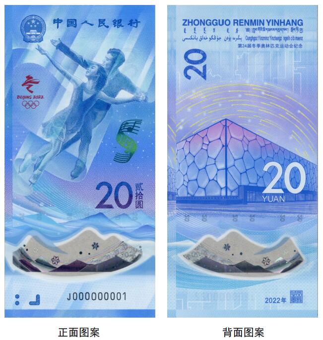 正面圖案:正面主景為花樣滑冰運動員圖案,上方為中華人民共和國國徽、“中國人民銀行”行名,左側(cè)為第24屆冬季奧林匹克運動會會徽,右側(cè)為光彩光變樂譜圖案、面額數(shù)字“20”與漢字“貳拾圓”,下方為動感全息圖案、透明視窗、盲文面額標(biāo)記和冠字號碼。