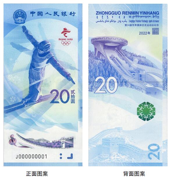 正面圖案:正面主景為自由式滑雪運動員圖案,上方為中華人民共和國國徽、“中國人民銀行”行名,右側(cè)為第24屆冬季奧林匹克運動會會徽、面額數(shù)字“20”與漢字“貳拾圓”,下方為動感全息圖案、盲文面額標(biāo)記和冠字號碼。