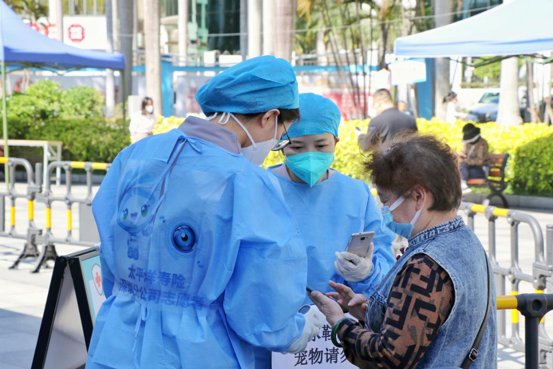 自3月9日起,中國太保壽險(xiǎn)深圳分公司志愿者每天分兩批前往蓮花一村社區(qū)核酸點(diǎn)開展志愿服務(wù)。在社區(qū)入口,他們嚴(yán)守“入口關(guān)”,輕聲提醒社區(qū)居民和訪客掃描“場所碼”,認(rèn)真查驗(yàn)每一位居民和訪客的健康碼情況;在核酸服務(wù)隊(duì)伍,他們耐心維持隊(duì)伍秩序,提醒居民做好自我防護(hù)、保持一米距;在核酸服務(wù)綠色通道處,他們以熱情的態(tài)度詳細(xì)解答居民的疑惑,指導(dǎo)老人、小孩和特殊人群掃碼、填寫資料;在居民樓里,他們拿著小喇叭,一層樓一層樓地提醒居民們下樓做核酸......他們?nèi)σ愿埃栽鷮?shí)的工作、貼心的服務(wù)當(dāng)好疫情聯(lián)防聯(lián)控的“守門員”“服務(wù)員”“宣傳員”,用實(shí)際行動(dòng)點(diǎn)起了陰霾下幾抹火紅的溫暖,架起了抗疫防疫“暖心橋”。