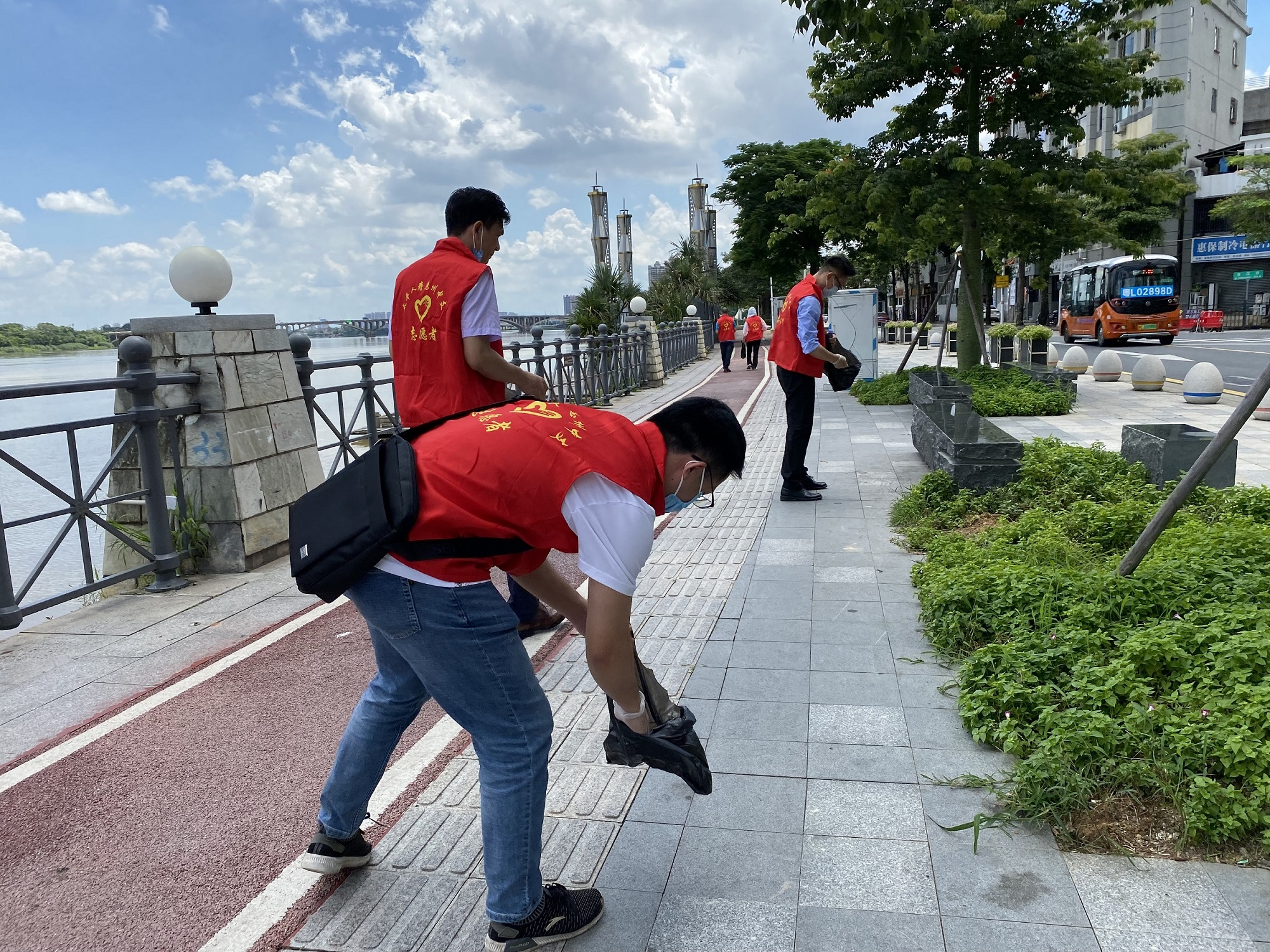 身穿紅馬甲的太平人在惠州街頭“美化”城市道路。(太平人壽供圖)
