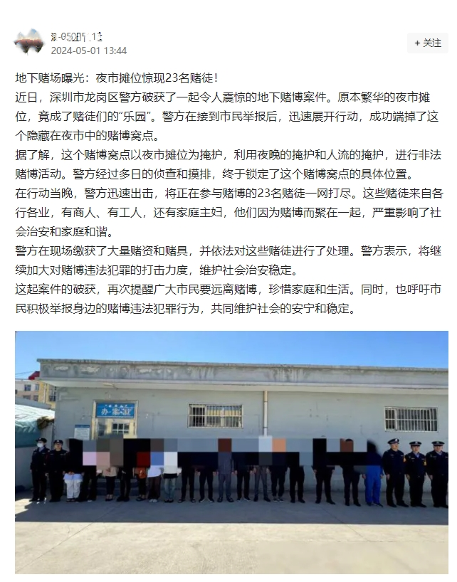 有網(wǎng)民在某社交平臺(tái)發(fā)帖稱:“近日,深圳市龍崗區(qū)破獲了一起令人震驚的地下賭博案件。原本繁華的夜市攤位,竟成了賭徒們的‘樂園’?!饼垗弲^(qū)相關(guān)部門第一時(shí)間對(duì)該內(nèi)容進(jìn)行核查,確認(rèn)此消息不實(shí),龍崗區(qū)沒有發(fā)生此類案件。