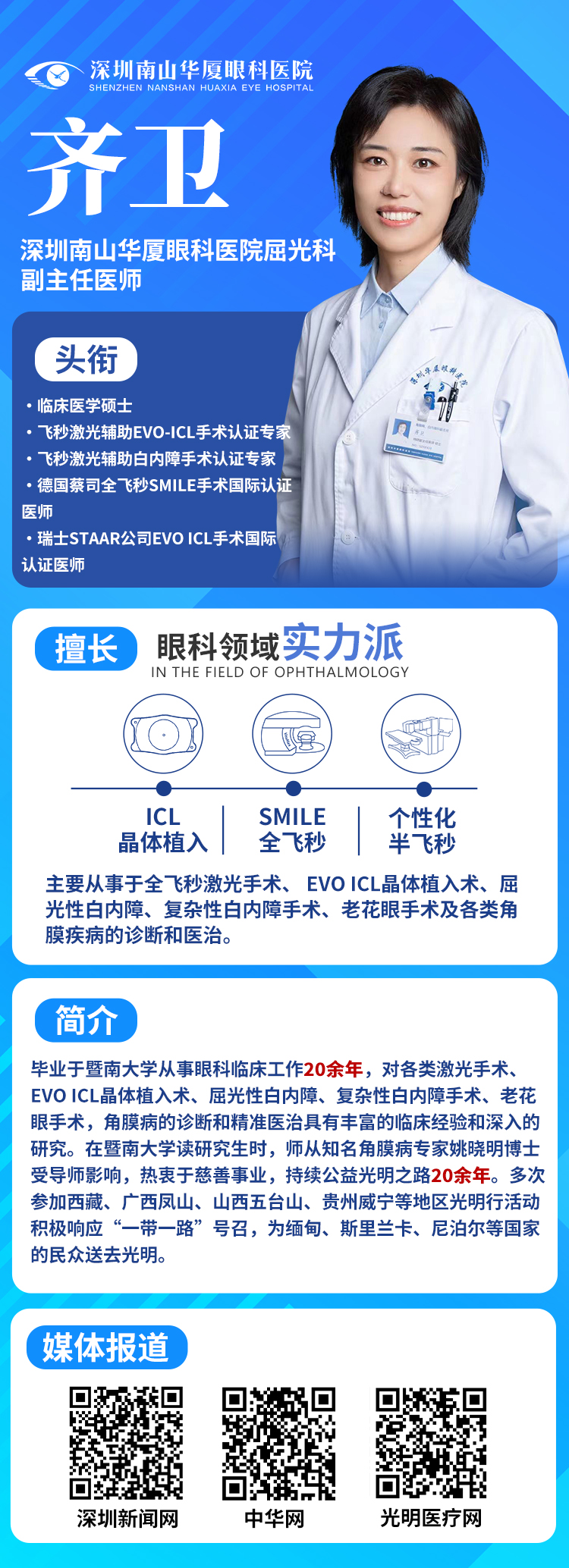 畢業(yè)于暨南大學的齊衛(wèi)主任,師從知名角膜病專家姚曉明博士,從求學時起就對眼科事業(yè)的熱愛。臨床工作中,而且她在激光手術、EVO ICL 晶體植入術、屈光性白內障手術等領域積累了深厚造詣。