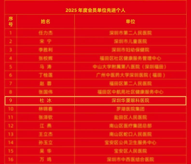 深圳新聞網(wǎng)2026年1月29日訊(記者 林恒鑫)1月27日,深圳市社區(qū)衛(wèi)生協(xié)會公布了2025年度優(yōu)秀分支機構及先進個人名單,深圳華廈眼科醫(yī)院副院長杜冰教授因在社康眼健康服務中的突出表現(xiàn),榮獲“2025年度會員單位先進個人”稱號。