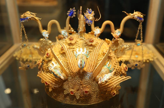 此次文博會,楚釹子品牌展出鳳冠霞帔婚配系列、宅配梅蘭竹菊系列、佛像系列產(chǎn)品等近百余件。其中鳳冠霞帔系列作品,以巧妙的花絲鑲嵌技藝,糅合中國傳統(tǒng)技藝,融入現(xiàn)代婚紗設(shè)計理念,打造出流光溢彩、雍容華貴的現(xiàn)代宮廷藝術(shù)之美。