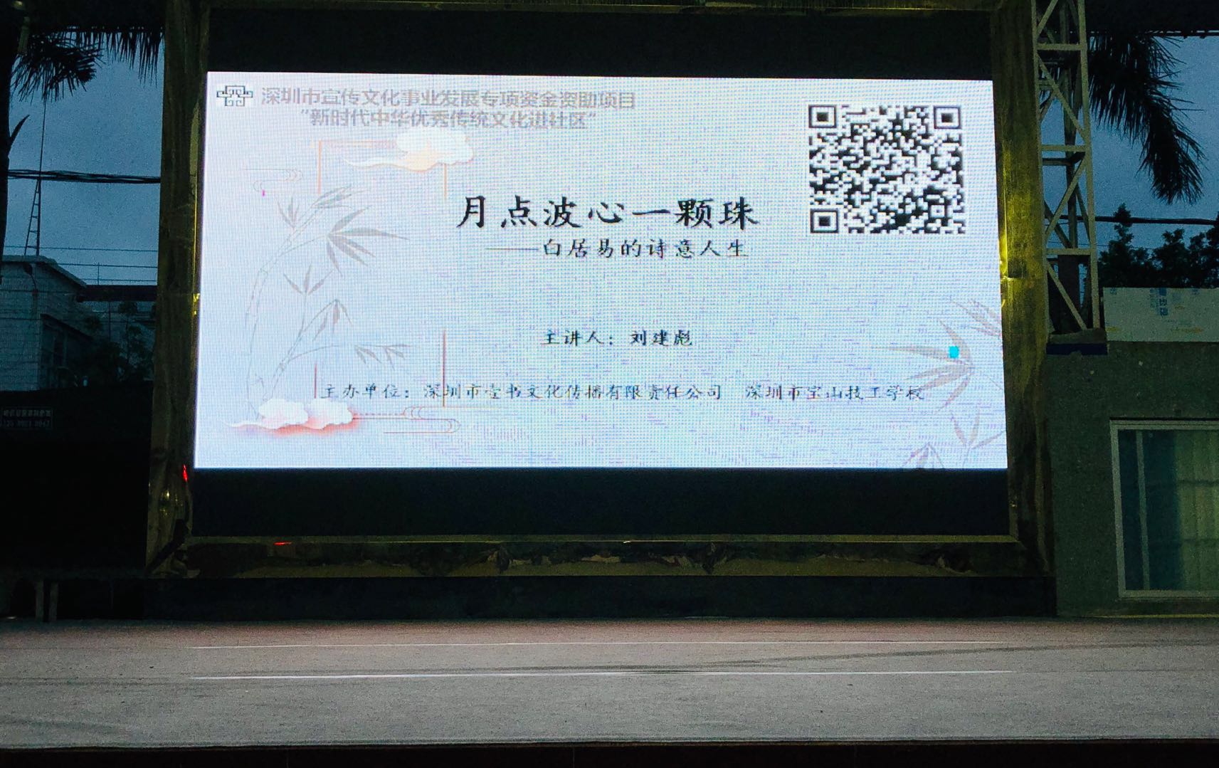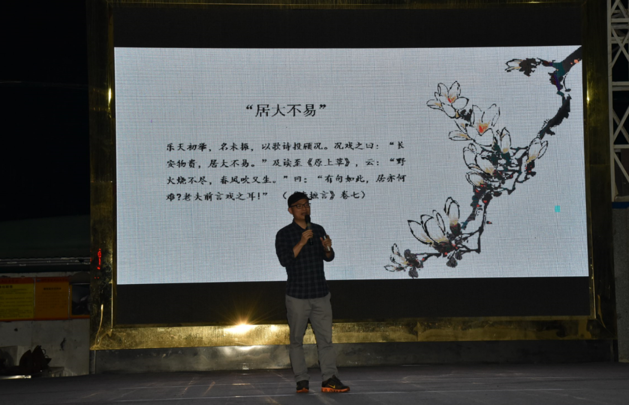 5月29日晚上,“新時代中華優(yōu)秀傳統(tǒng)文化進社區(qū)”系列活動第三場公益文化講座之“月點波心一顆珠——白居易的詩意人生”在深圳市寶山技工學(xué)校寶山大舞臺拉開帷幕。