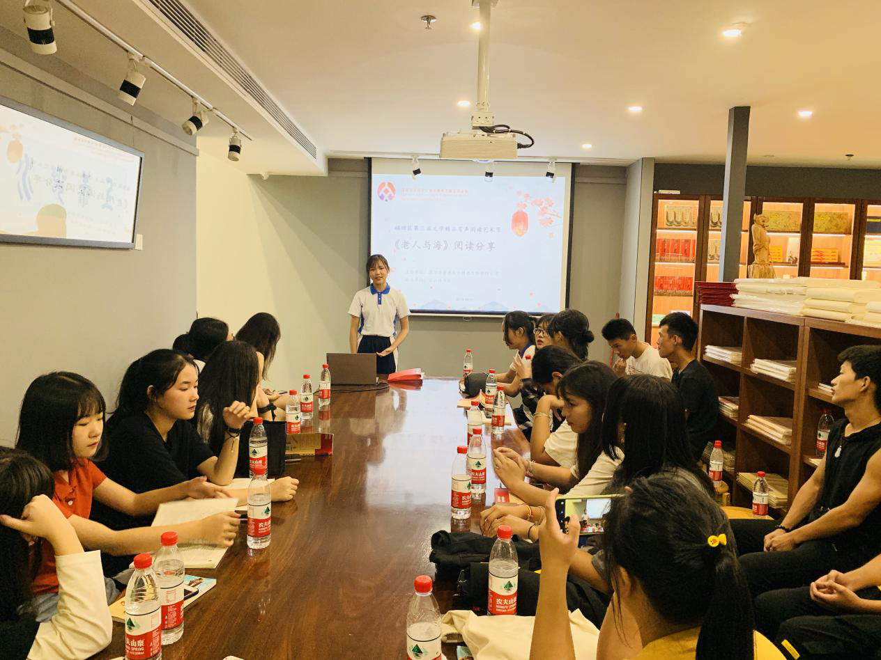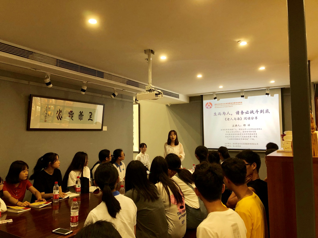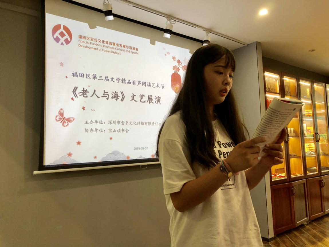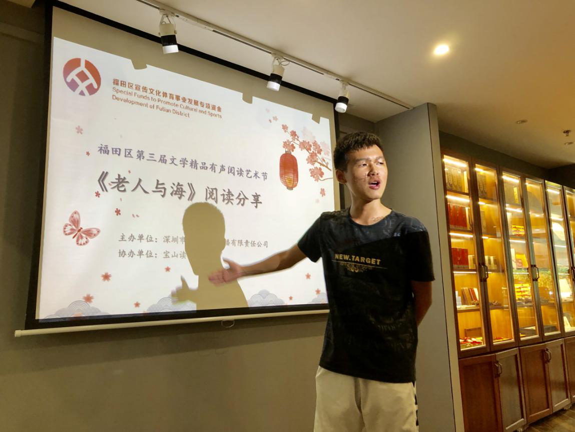 深圳新聞網(wǎng)訊 2019年9月7日,由深圳市壹書文化傳播有限責(zé)任公司主辦、寶山讀書會(huì)協(xié)辦的“福田區(qū)第三屆文學(xué)精品有聲閱讀藝術(shù)節(jié)”之《老人與海》閱讀分享會(huì)暨文學(xué)作品朗誦會(huì)在簡閱書吧香蜜湖店成功舉辦。來自深圳市寶山技工學(xué)校的學(xué)子們?cè)谥髦v人的啟示下分享閱讀感悟、誦讀精彩文摘,在文藝展演中體會(huì)圣地亞哥抗擊命運(yùn)的人生哲學(xué)。