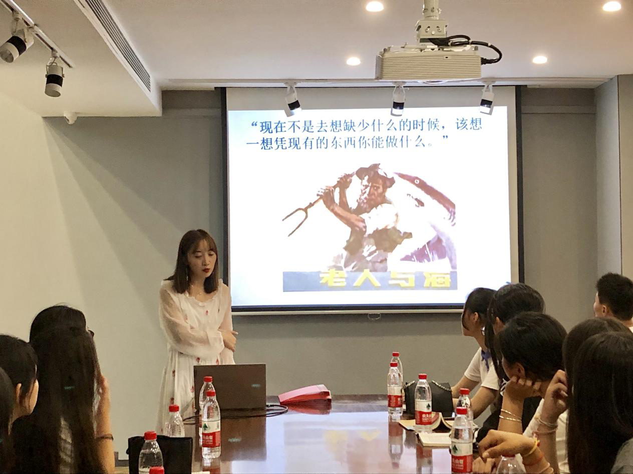 《老人與?!吠ㄟ^講述一個(gè)老漁夫的故事,揭示了人類共同的命運(yùn),給讀者帶來關(guān)于勇氣、不屈不撓、與命運(yùn)作斗爭的精神啟迪。圍繞“生而為人,請(qǐng)務(wù)必戰(zhàn)斗到底”這一主題,邵洋提出了“是選擇放棄,還是一往直前?”這一問題,引起在座同學(xué)的思考。隨后,她又通過解讀《老人與?!分械挠飨笈c藝術(shù)、生命與理想,為同學(xué)們總結(jié)值得學(xué)習(xí)的寫作思路。