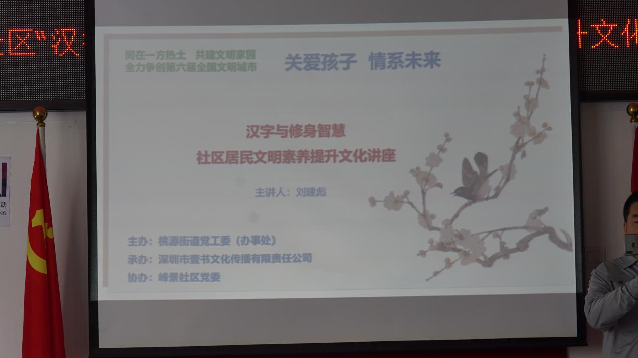 11月8日下午,該項目首場講座在峰景社區(qū)工作站拉開了序幕,本次講座由桃源街道黨工委(辦事處)主辦、深圳市壹書文化傳播有限責(zé)任公司承辦、峰景社區(qū)黨委協(xié)辦,邀請到壹讀書會創(chuàng)始人、知名閱讀推廣人、《漢字與修身智慧》的作者劉建彪擔(dān)任主講嘉賓。在深圳爭創(chuàng)全國文明城市的當(dāng)下,桃源街道辦積極響應(yīng)市委市政府的號召,不斷探索籌劃、推陳出新,以“‘同在一方熱土共建文明家園’——全力爭創(chuàng)第六屆全國文明城市”為文明創(chuàng)建標(biāo)語,開展題為“學(xué)習(xí)漢字與修身智慧,以傳統(tǒng)文化力量促文明”的文化講座,為創(chuàng)建文明城市貢獻(xiàn)一份力量。
