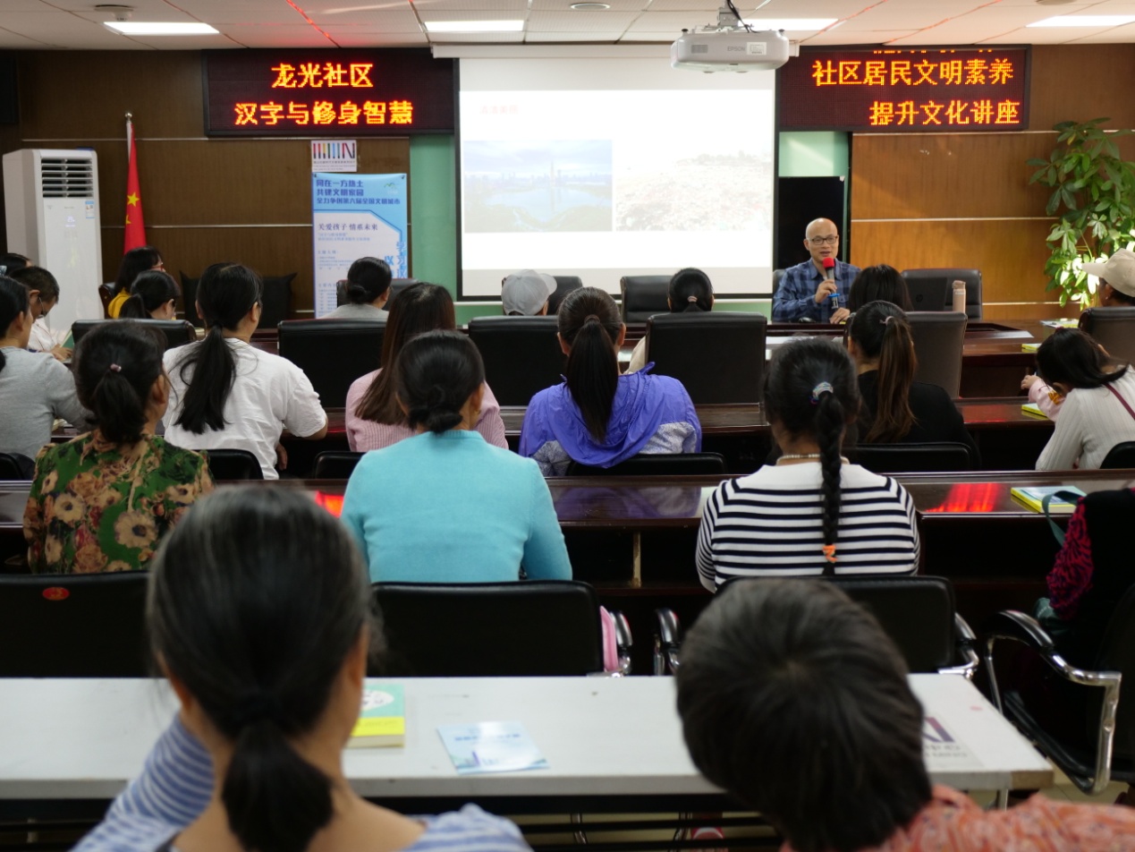 深圳新聞網(wǎng)訊 為更一步提升社區(qū)居民文化素養(yǎng),推動(dòng)社區(qū)創(chuàng)建第六屆全國文明城市工作邁上新的臺(tái)階,11月19日下午,龍光社區(qū)工作站組織社區(qū)居民參加“‘漢字與修身智慧’社區(qū)居民文明素養(yǎng)提升”文化講座,邀請(qǐng)壹讀書會(huì)創(chuàng)始人、知名閱讀推廣人、《漢字與修身智慧》的作者劉建彪擔(dān)任主講嘉賓,從中華文明的基因(漢字)出發(fā),解讀深圳市民公約,旨在啟發(fā)居民在中華優(yōu)秀傳統(tǒng)文化的感召之下,踐行文明禮儀,用實(shí)際行動(dòng)去推進(jìn)文明城市的創(chuàng)建。