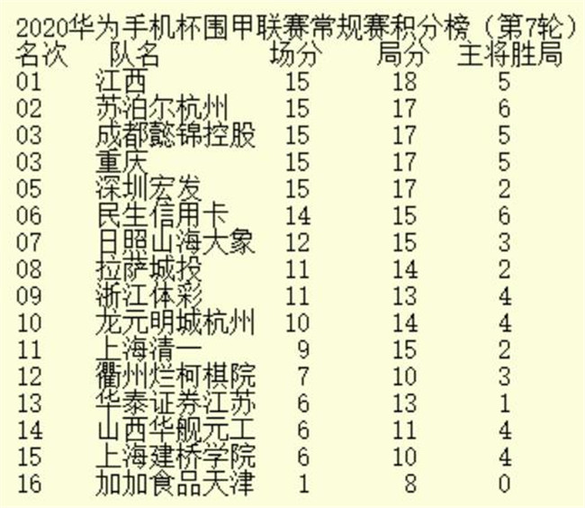 《2020年華為手機(jī)杯中國圍甲聯(lián)賽第七輪積分榜》