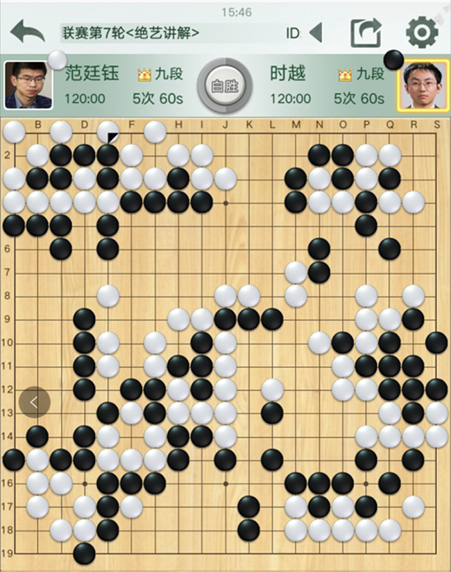第二臺(tái),時(shí)越執(zhí)黑對(duì)陣世界冠軍范廷鈺。開局白取地黑取勢(shì),在中央的戰(zhàn)斗中,黑棋選擇開劫失誤,轉(zhuǎn)換后白棋勝勢(shì)。
