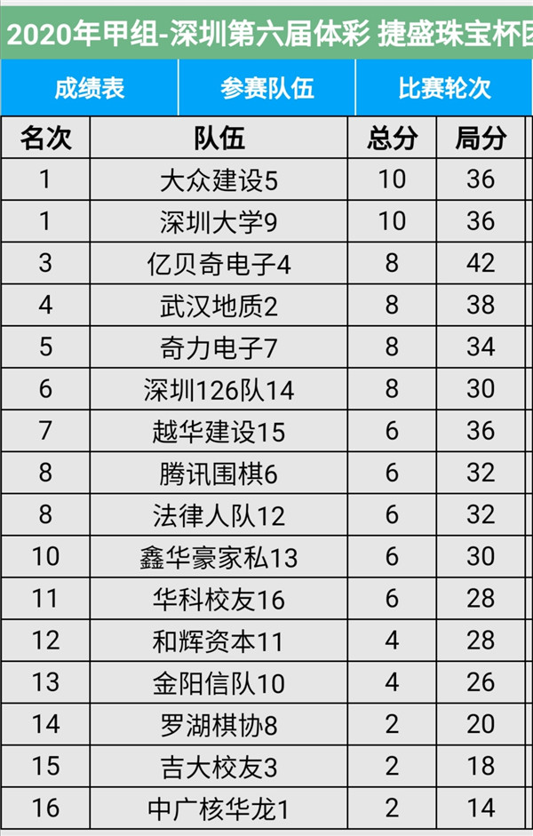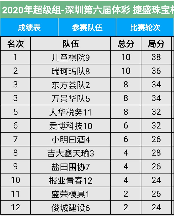 見圳客戶端?深圳新聞網(wǎng)2020年11月8日訊(記者周錦春)第六屆“體彩?捷盛珠寶杯”深圳市圍棋聯(lián)賽繼續(xù)在羅湖區(qū)藝嘉大酒店展開,今天是第二場,有第4輪至第6輪的比賽。目前,超級組中,兒童棋院隊、瑞珂瑪隊領(lǐng)先;甲級組中,大眾建設(shè)、深圳大學(xué)領(lǐng)先。具體賽程結(jié)果請看本文附后表格。