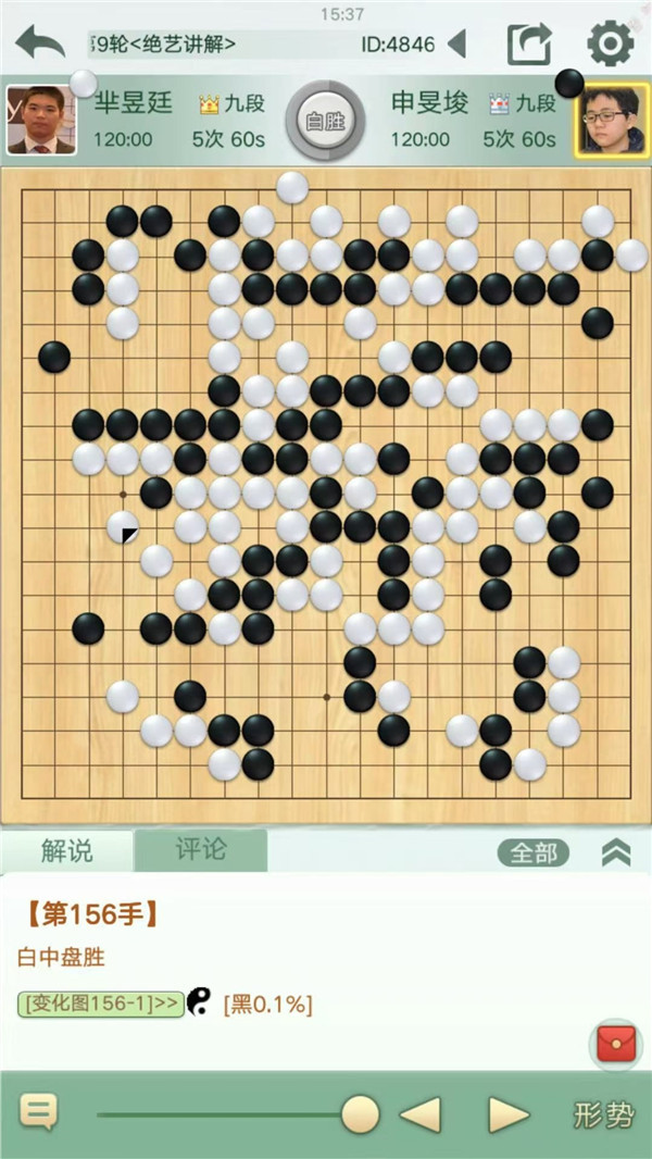 慢棋第一臺由深圳宏發(fā)隊的陶欣然八段執(zhí)白對陣江蘇隊的陳賢八段。雙方開局下出一個復雜的大型變化,局面一度兩分。序盤結(jié)束時陶欣然下出一步緩手,使得勝負的天秤向黑方傾斜。弈至官子階段,黑方下出了大意的敗招,單官沖斷白兩塊活棋,相當于自停一手,使得白棋追回不少目數(shù)。之后黑棋如繼續(xù)收官局面仍然細微,但陳賢在出現(xiàn)失誤后心態(tài)失衡,孤注一擲殺白大龍,最終失敗,白棋幸運獲勝。