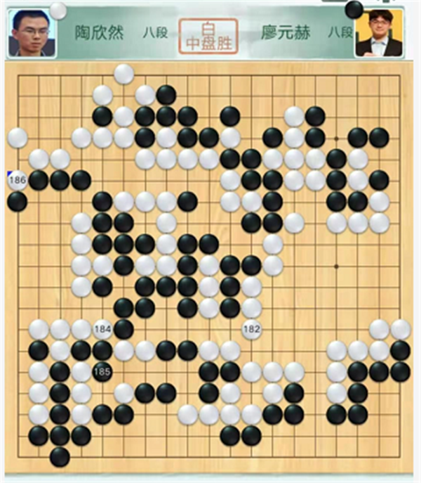 第四臺(tái)慢棋,由深圳隊(duì)陶欣然八段執(zhí)白對(duì)陣成都隊(duì)廖元赫八段。中央戰(zhàn)斗時(shí)候白棋選擇退讓,反倒形成打劫,黑棋劫勝后大幅領(lǐng)先。之后黑棋官子階段不夠冷靜細(xì)膩,幾處小虧損之后被白反超。黑棋看到局面危險(xiǎn)更加沖動(dòng)的選擇和白棋互相破空,結(jié)果又虧損導(dǎo)致差距越來(lái)越大。陶欣然執(zhí)白中盤(pán)勝廖元赫。