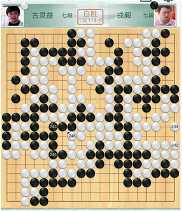 第三臺(tái)快棋,深圳隊(duì)的戎毅七段執(zhí)黑對(duì)陣成都隊(duì)的古靈益七段。黑棋開(kāi)局采取取地策略。下方黑棋形狀處理保守,子效重復(fù)虧損。之后黑棋一直沒(méi)有明顯勝機(jī),最終以1又1/4子落敗。戎毅執(zhí)黑1又1/4子負(fù)古靈益。