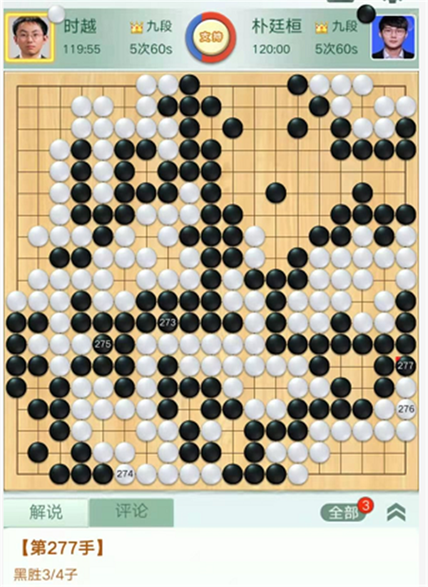 第二臺(tái)主將,由深圳隊(duì)時(shí)越九段執(zhí)白對(duì)陣成都隊(duì)韓國(guó)世界冠軍樸廷桓九段。開(kāi)局下方雙方各有小失誤,局面均勢(shì)。之后左上黑棋行棋過(guò)分,白棋領(lǐng)先。白棋在黑右上角破空形成打劫,黑棋連走兩手分開(kāi)右邊白棋進(jìn)行攻擊。白棋治孤中錯(cuò)失簡(jiǎn)明獲勝的下法,但是活出后依然稍好。緊接著白棋沒(méi)有選擇最大的官子,被黑棋走到后黑棋領(lǐng)先。之后黑棋官子收束滴水不漏,以最小差距3/4獲勝。時(shí)越執(zhí)白3/4子負(fù)樸廷桓。