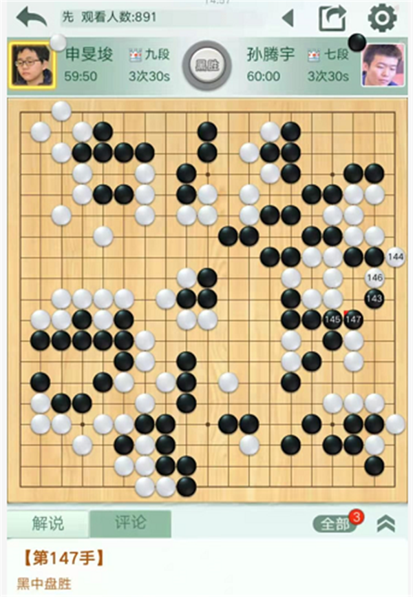 第一臺(tái)快棋,由深圳隊(duì)外援申旻埈九段執(zhí)白對(duì)陣民生隊(duì)的孫騰宇七段。白棋開(kāi)局順暢,中盤下邊雙方小有失誤,依然白棋領(lǐng)先。之后白棋良好的掌握局面,優(yōu)勢(shì)擴(kuò)大。進(jìn)入官子,白棋沒(méi)有補(bǔ)掉隱患,進(jìn)入中央破黑空時(shí)較為沖動(dòng),選點(diǎn)失誤造成虧損。最后被黑右邊進(jìn)入白空后反殺白棋,申旻埈執(zhí)白中盤負(fù)孫騰宇。