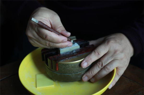 船木工作臺(tái)擺的全是寧老師的心肝寶貝:進(jìn)口或定制的篆刻臺(tái)、鋸、刀等。
