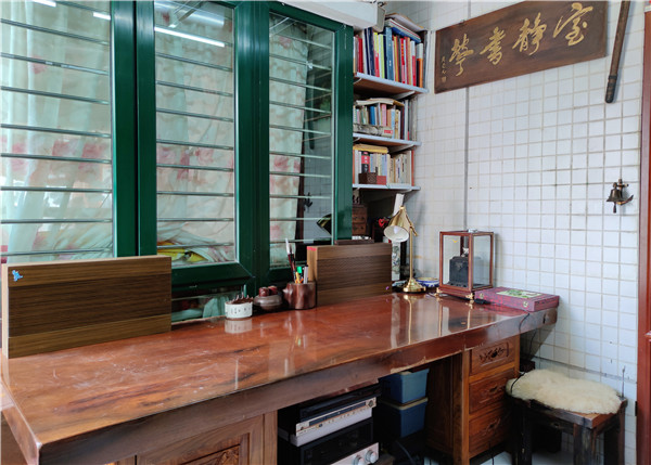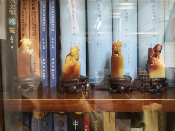 書房約莫20平米不到,擺設(shè)裝點(diǎn)里透射出寧老師的日常。當(dāng)陽光照進(jìn)這間寧靜的小屋,他習(xí)慣于先打開音樂,在舒心樂聲中開始他一天讀書、刻印的生活。累了,在小桌上喝喝茶,或彈上一段古琴,或者玩賞一下他收藏的心愛鈴鐺。據(jù)介紹,他專門收藏西北一帶富貴人家的馬鈴,目前有100余個(gè)。寧老師說,“讀書、養(yǎng)性、積德、延年”是其志向,井井有條、一絲不茍的書房就是佐證。長(zhǎng)期的濡養(yǎng),讓人感到寧老師的談吐從容、情趣高雅、思想深刻。映照在篆刻上,寧老師的印作也日漸沉穩(wěn)大氣,除姓名印章外,所刻內(nèi)容啟人心智,如“以正大立心”“以光明行事”“修辭立其誠”等等。