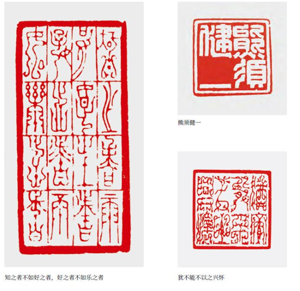 說起自己的代表作,寧老師十分謙虛,但筆者還從他的印屏、印作中,從以往宣傳報(bào)道中理出了一些頭緒。比如,剛來深圳,有感于鄧小平同志的功績(jī),刻了一方《總設(shè)計(jì)師鄧小平》,陳巨來的印味明顯。2013年寶安區(qū)書法協(xié)會(huì)發(fā)行新年掛歷上印有“蛇年大吉”印章,便出自他手。那是一方金文白文印,整體舒朗開闊,靈動(dòng)高古,爛漫天成,不失為其代表作。還有,用一方印完整地刻出了268字的《心經(jīng)》亦是獨(dú)一無二的。他為友所刻《真善美》朱文鳥蟲篆,布局疏密自然,光潔妍美,婀娜多姿,韻味無窮。元朱文白文印《熊須健一》,疏密呼應(yīng),“一”字處大片留紅,與另三字形成強(qiáng)烈對(duì)比,“須”字三撇作美化處理,形成印眼。此印工穩(wěn)爽朗,行刀如筆,耐人尋味。還有應(yīng)約為著名棋手武宮正樹、徐瑩等所刻鳥蟲篆印均“嵌入”圍棋黑白二子的元素,自然貼切,又妙趣橫生。還有為出版社、書局、書籍插圖以及賽事配刻的印章更是數(shù)不勝數(shù)。當(dāng)前,寧老師依然精神飽滿、創(chuàng)作旺盛,相信未來還會(huì)不斷有令人驚喜的印品佳作問世。