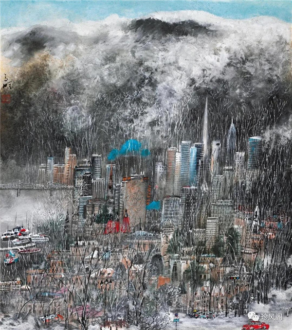 來(lái)自南京而定居于深圳的宋玉明,試圖將新金陵畫(huà)派表現(xiàn)現(xiàn)實(shí)的變革精神用于現(xiàn)代城市山水畫(huà)的探索上。作為新金陵畫(huà)派的第二代畫(huà)家,宋玉明直接承傳了宋文治表現(xiàn)現(xiàn)代太湖人居環(huán)境秀潤(rùn)而精巧的家法,并將此種大山景加小民居的畫(huà)法轉(zhuǎn)用到深圳城市形態(tài)的表現(xiàn)上。這里,我們一方面可以看到深圳作為一個(gè)新興的現(xiàn)代城市借山而筑、注重自然環(huán)境在城市生態(tài)建設(shè)上的積極作用;另一方面,深圳這種與自然相統(tǒng)一的現(xiàn)代化城市建設(shè)理念,也為宋玉明進(jìn)行城市山水畫(huà)創(chuàng)作提供了完美的表現(xiàn)對(duì)象。在《深圳文錦渡》等作品里,我們看到了畫(huà)家巧妙地將城市現(xiàn)代建筑與自然山水融為一體的表現(xiàn)。這些畫(huà)作,大多以勾線渲染的方法表現(xiàn)遠(yuǎn)景中的商用或市政建筑設(shè)施,也因這些建筑被設(shè)置在中遠(yuǎn)景,不僅減少了建筑塑造的困窘,而且突出了這些人居建筑與自然相得益彰的和諧關(guān)系。這些畫(huà)作,從嚴(yán)格的意義上說(shuō),仍然是山水畫(huà),而宋式小散鋒皴以及云煙雨霧的渲染,也為畫(huà)面增添了幽深、恬靜、高雅、平和的意趣與境界。這些畫(huà)作,讓我們所熟悉的城市從一個(gè)相對(duì)遙遠(yuǎn)的視角來(lái)觀看,既因距離產(chǎn)生了一種從未體驗(yàn)過(guò)的美感,也較好地體現(xiàn)了現(xiàn)代城市與自然占位的協(xié)調(diào)統(tǒng)一、舒適宜居的比例關(guān)系。