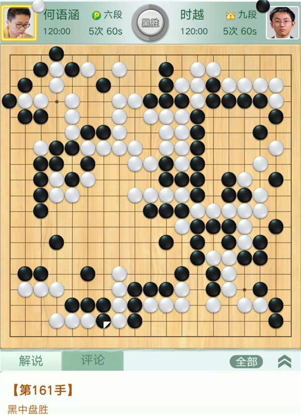 緊接著,一臺(tái)時(shí)越九段執(zhí)黑對(duì)何語涵六段干凈利落,時(shí)越在對(duì)局中充分發(fā)揮自身勢大力沉的棋風(fēng),以凌厲的屠龍刀法絕殺一條大龍,痛快淋漓地結(jié)束了戰(zhàn)斗。關(guān)鍵節(jié)點(diǎn)在中盤,黑棋對(duì)右邊白子簡單吃住尾巴則優(yōu)勢,實(shí)戰(zhàn)黑棋追求整體殺白,白棋應(yīng)對(duì)失誤大龍憤死,行棋161手。