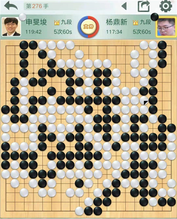 二臺(tái)主將申旻俊執(zhí)白對(duì)陣楊鼎新。右邊戰(zhàn)斗黑棋有所失誤,白棋局面大好。后來黑棋頑強(qiáng)追趕,最終還是白棋以最小優(yōu)勢1/4子獲勝。