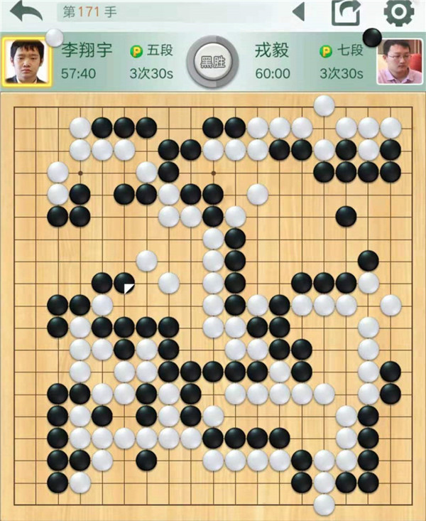 今日比賽中,三臺(tái)快棋戎毅執(zhí)黑對(duì)陣小將李翔宇,黑棋下方作戰(zhàn)失利早早進(jìn)入敗勢。后來白棋中央突然將自己大龍走死,黑棋幸運(yùn)獲勝,行棋171手。