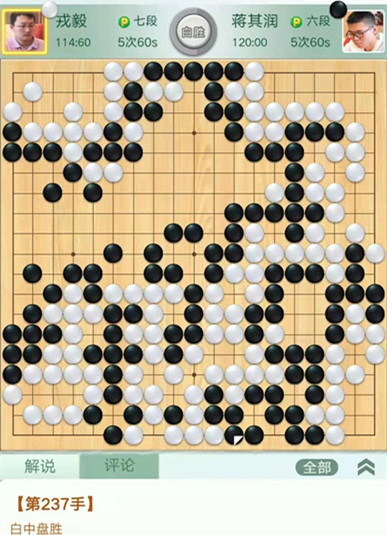 時越快棋執(zhí)白對陣張濤。右邊作戰(zhàn)時候,黑棋沒有選擇造劫劫爭而是退讓,被白將右邊幾子吃掉后又吃掉右上黑棋,黑棋局面落后。之后黑棋右下又死活看錯被白先手活出,導(dǎo)致雪上加霜,實際上棋局已經(jīng)結(jié)束。