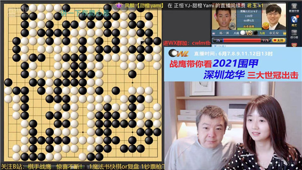 今日大局好,教練羅洗河心情自然好。于是興高采烈地去虎牙直播和戰(zhàn)鷹侃棋了。戰(zhàn)鷹是職業(yè)二段,女子圍甲主力選手,人美、棋強(qiáng)、口才好,虎牙直播間圍棋知名主播,是深圳龍華隊(duì)網(wǎng)上直播合作人。深圳龍華隊(duì)后續(xù)比賽將持續(xù)在虎牙平臺(tái)直播,歡迎大家關(guān)注哦!