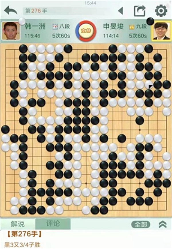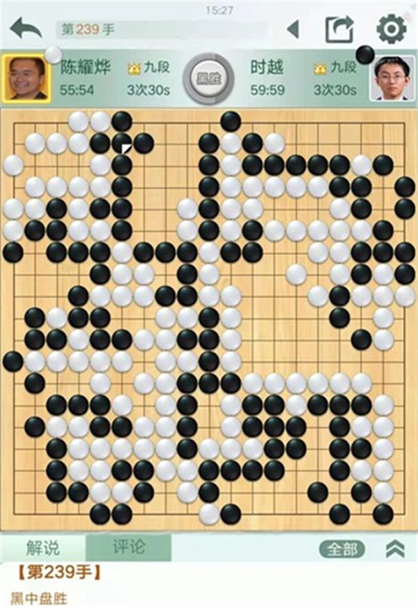 時(shí)越快棋執(zhí)黑對(duì)陣世界冠軍陳耀燁。中盤黑棋在右邊白勢中試應(yīng)手,白棋應(yīng)對(duì)松緩,被黑棋先手便宜十幾目棋,黑局面領(lǐng)先。之后黑棋行棋嚴(yán)謹(jǐn),中盤獲勝。