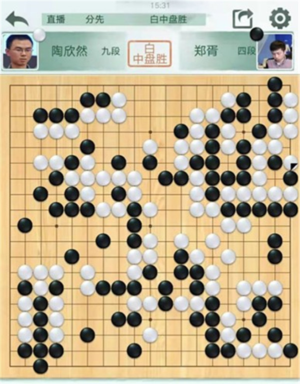 陶欣然執(zhí)白對(duì)陣小將鄭胥。黑棋開局在左邊虧損,局面落后。最后黑棋在右邊破釜沉舟尋求戰(zhàn)機(jī),白棋計(jì)算精準(zhǔn),將黑全殺,白中盤勝。