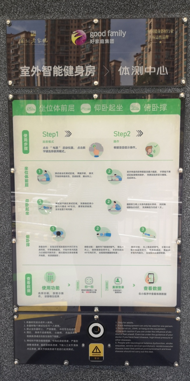 研發(fā)該套設(shè)備的深圳企業(yè)好家庭事業(yè)有限公司負(fù)責(zé)人張佳華表示,“此次被調(diào)研的室外智能健身設(shè)施已經(jīng)升級至4.0版本?;谖锫?lián)網(wǎng)、5G與大數(shù)據(jù)系統(tǒng),這套智能化設(shè)施擁有人臉識別、無感采集健身數(shù)據(jù)、手機(jī)掃碼可一鍵獲取專屬運(yùn)動處方的功能,可為市民提供個性化、多元化、科學(xué)化的健身服務(wù)。”