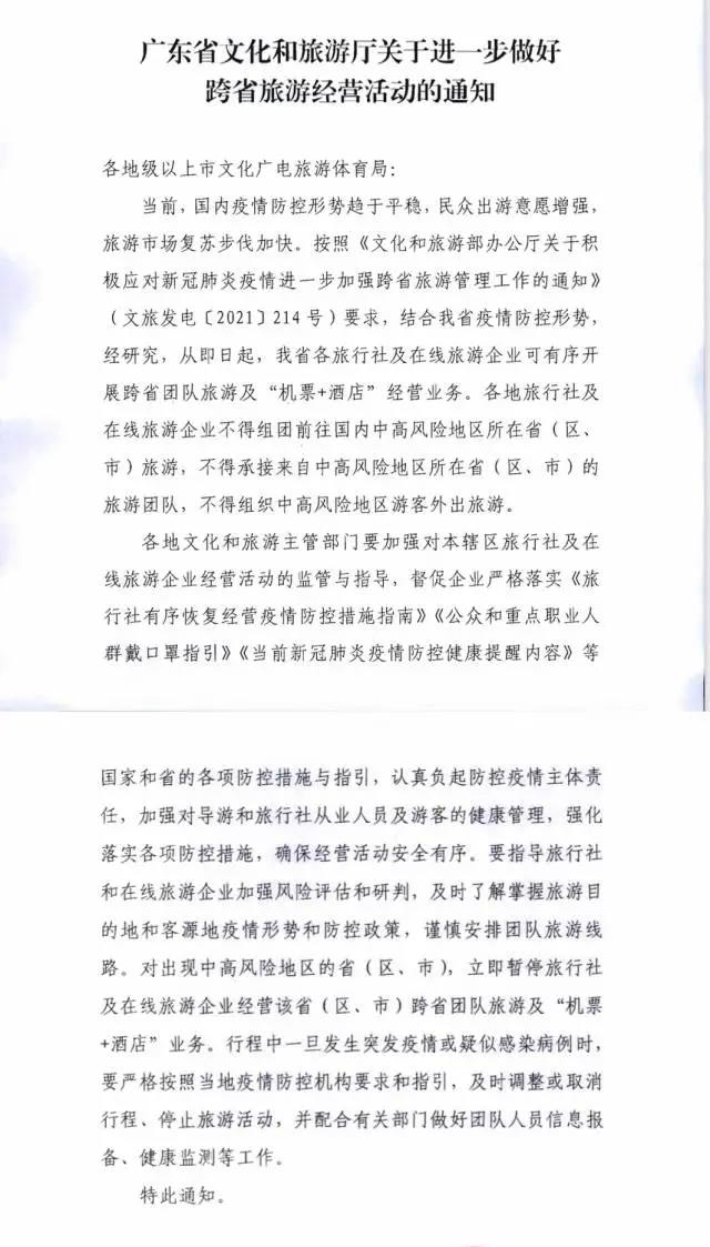 深圳新聞網(wǎng)2021年8月25日訊 (記者 田志強(qiáng))廣東省文化和旅游廳今日發(fā)布《關(guān)于進(jìn)一步做好跨省旅游經(jīng)營(yíng)活動(dòng)的通知》,通知明確:從即日起,我省各旅行社及在線旅游企業(yè)可有序開展跨省團(tuán)隊(duì)旅游及“機(jī)票+酒店”經(jīng)營(yíng)業(yè)務(wù)。各地旅行社及在線旅游企業(yè)不得組團(tuán)前往國(guó)內(nèi)中高風(fēng)險(xiǎn)地區(qū)所在省(區(qū)、市)旅游,不得承接來(lái)自中高風(fēng)險(xiǎn)地區(qū)所在?。▍^(qū)、市)的旅游團(tuán)隊(duì),不得組織中高風(fēng)險(xiǎn)地區(qū)游客外出旅游。