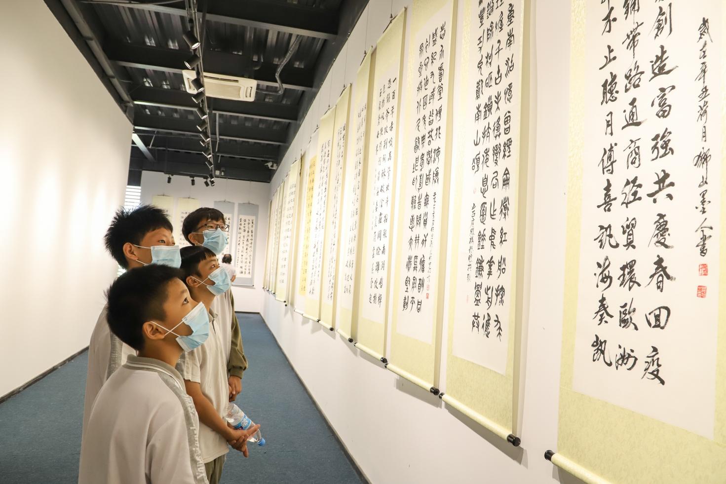 展覽開幕式上,吸引了眾多楹聯(lián)家、楹聯(lián)愛好者以及市民游客前來參觀,更有學校師生組團來參觀。中國楹聯(lián)學會顧委副主任、廣東楹聯(lián)學會顧委主任鄒繼海在開幕式上介紹到,百字百聯(lián)百幅書法作品慶建黨百周年,這四個一百的征聯(lián)活動在全國是最早的,也是唯一的,開創(chuàng)了楹聯(lián)文化界征聯(lián)的先河,值得高興,也值得我們自豪。隨后,鄒繼海宣布此次“觀音山杯”百字百聯(lián)百幅書法作品慶祝中國共產(chǎn)黨建黨一百周年的聯(lián)墨展觀音山站正式開幕。